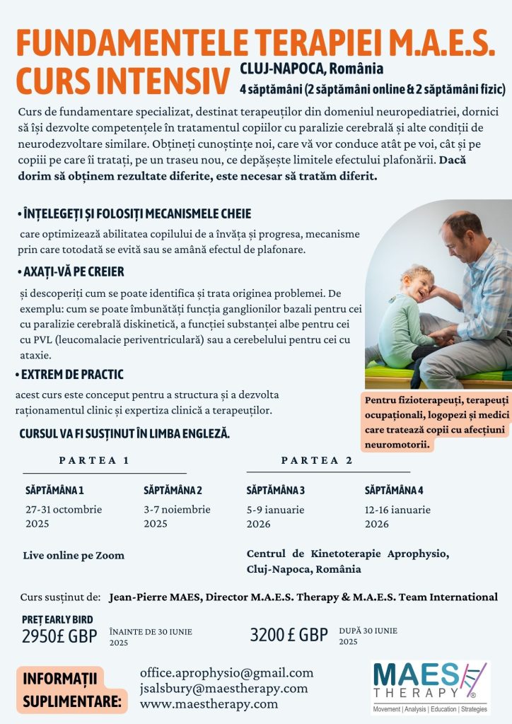 Titlul Cursului:„Analiza Mișcării și Strategii Educaționale pentru Tratamentul Copiilor cu Paralizie Cerebrală și condiții neurodezvoltative similare” Format:Curs Hibrid de 4 săptămâni (2 săptămâni online & 2 săptămâni față în față) Un curs de bază specializat pentru terapeuți pediatrici (kinetoterapeuți, terapeuți ocupaționali, logopezi) care doresc să facă mai mult în terapia pentru copiii cu paralizie cerebrală…